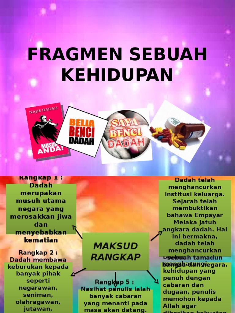 Sajak Fragmen Sebuah Kehidupan-Tingkatan 3. Hari ini Syifak dan Adila membentangkan sajak Fragmen Sebuah Kehidupan karya Shamsudin Othman. Dadah juga menyebabkan kejatuhan bangsa dan negaraContohnya Empayar Melaka tumbang kerana dadahpengajaran.